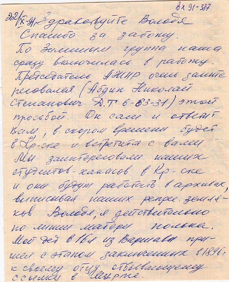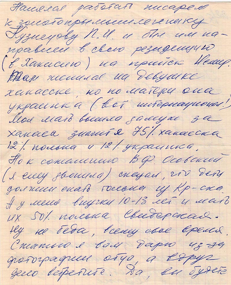 Мы заинтересовали наших студентов-хакасов в Кр-ске и они будут работать в архивах, выписывая наших репресс. земляков. Володя, я действительно по линии матери полька. Мой дед в 16 л из Варшавы пришел с этапом заключенных в 1896 г к своему отцу отбывающему ссылку в Мурте. Нанялся работать писарем к золотопрымышленнику Кузнецову П.И. и был им направлен в свою резиденцию (в Хакасию) на прииск Немир. Там женился на девушке хакаске, но по матери она украинка (вот интернационал!). Мол мать вышла замуж за хакаса значит я 75% хакаска 12% полька и 12% украинка. Но к сожалению В.Ф. Осовский (я ему звонила) сказал, что дети должны ехать только из Кр-ска. А у меня внучки 10-13 лет и мать их 50% полька Свидерская. Ну не беда, всему свое время.