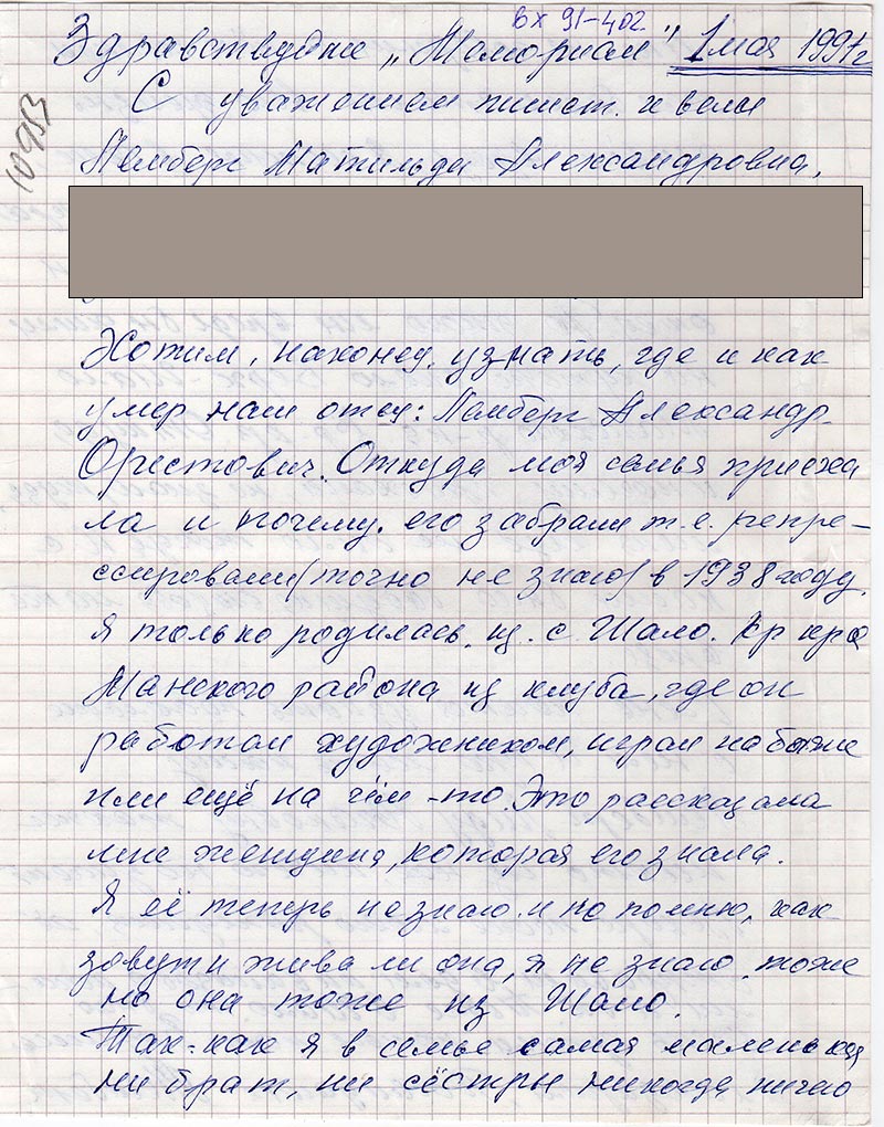 С уважением пишет к вам Лемберг Матильда Александровна, прожив: город …………… с 1938 года рожд. 5 июля.