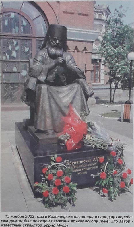Епископ Красноярский и Енисейский (1942-1944 гг.), архиепископ Ставропольский (позже, Симферопольский и Крымский) Лука. Отбывая очередную ссылку в 1941 году в посёлке Большая Мурта Красноярского края, попросил отсрочить её на время войны для оказания медпомощи раненым, и в годы Великой Отечественной войны заведовал хирургическим отделением эвакогоспиталя № 1515 в Красноярске. В 1946 году за «Очерки гнойной хирургии» была присуждена Сталинская премия 1 степени, больше половины которой он пожертвовал на помощь сиротам.